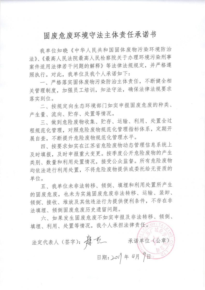 Letter of Commitment for the Responsibility of the Compliance Subject of the Solid Waste and Hazardous Waste Environment